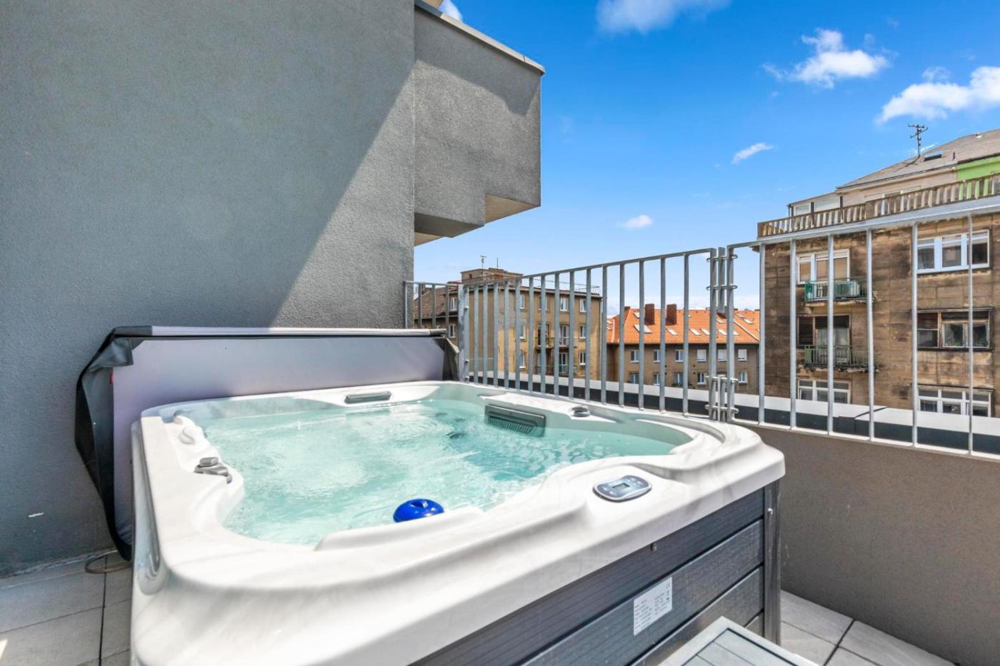 Two-Bedroom Apartment. The hot tub is the standout feature of this apartment. This spacious apartment comes with 1 living room, 2 separate bedrooms and 1 bathroom with a bath and free toiletries. Guests can make meals in the kitchen that features a stovetop, a refrigerator, a dishwasher and kitchenware. The air-conditioned apartment features a flat-screen TV with streaming services, a washing machine, soundproof walls, a tea and coffee maker as well as city views. The unit has 3 beds.